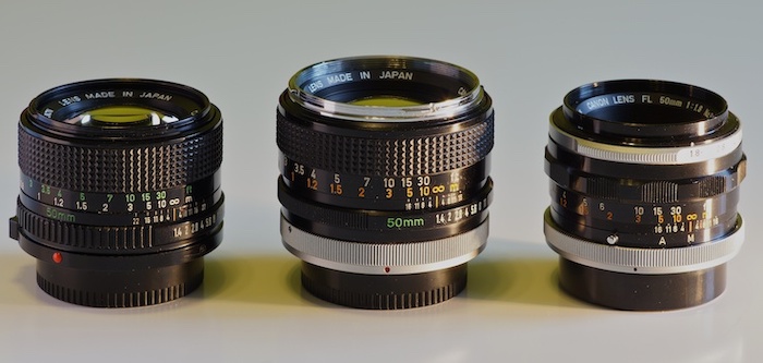 Canon FL- & FD-ObjektiveDie Objektive analoger Spiegelreflexkameras und analoger Sucherkameras machen richtig Spass an aktuellen Systemkameras und erreichen eine sehr gute Abbildungsqualität. Statt mit dem Autofocus wird "wie damals" manuell am Objektiv scharfgestellt. Die Peaking-Funktion der Kamera zeigt durch eine farbliche Hervorhebung an, welcher Bereich scharf gestellt ist. Eine Lupe kann zusätzlich dazu geschaltet werden - beides sehr hilfreich und einfach zu benutzen. Ebenfalls am Objektiv wird die Blende vorgewählt, die Einstellung der Belichtungszeit kann die Automatik der Kamera übernehmen. Der ISO-Wert kann manuell an der Kamera eingestellt, oder per "ISO Auto" von der Kamera eingestellt werden. Dank des besonders geringen Abstands zwischen Sensor und Objektiv-Bajonett steht genügend Platz für Bajonett-Adapter zur Verfügung. So lassen sich die unterschiedlichsten Objektive mit den entsprechenden Adaptern - die es für so ziemlich jedes jemals gebaute Bajonett gibt - verwenden. Und natürlich lassen sich auch die edlen Linsen aus Oberkochen/Jena, Fürth und Solms an einer Systemkamera verwenden. Die Preise für diese alten Objektive haben mit dem Aufkommen der spiegellosen Systemkameras angezogen, die nicht ganz so lichtstarken Versionen und die damaligen Standardobjektive (50mm) sind aber immer noch günstig zu bekommen. Meiner Meinung nach machen die Brennweiten 24 - 85mm als lichtstarke Ergänzungen zu den Autofocus-Zooms der Systemkameras den meisten Sinn. Lichtstarke Objektive mit größerem Weitwinkel gibt es kaum, oder sie sind sehr teuer. Alte Teleobjektive könnten für bestimmte Zwecke interessant sein, ich persönlich würde im Telebereich aber eher auf stabilisierte Autofokus-Objektive setzen. Durch meine fotografische Prägung in den 70ern - und weil ich noch zwei alte Canon-Objektive im Schrank hatte - habe ich mich auf Canon-Altglas konzentriert :-)
