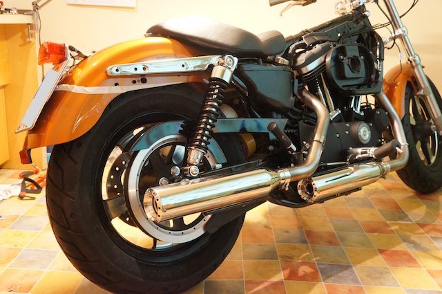 Um die Alltagstauglichkeit zu verbessern, habe ich auf Avon Cobra Reifen umgerüstet. Die Reifen fahren sich gut und auch bei Regen ist man sicher unterwegs. Netter Nebeneffekt ist die Breite des hinteren Reifens, der aussieht wie ein 160er. Interessant finde ich auch die Felgen der Sportster SuperLow, die mit den Maßen 18 x 3,5 vorne und 17 x 4,5 hinten eine aktuelle, noch sportlichere Bereifung ermöglichen würden.