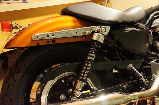 Wie sich herausstellte, ist es der Sitz der Sportster SuperLow, den ich dann nach kurzer Zeit ersteigern konnte und der sich sehr bequem fährt. Er bietet auch einen besseren Halt nach hinten als der originale Sitz der 48, ist für mich in dieser Beziehung aber immer noch nicht optimal. Seit einiger Zeit fahre ich nun den Sitz der Iron. Bei Gelegenheit werde ich ihn noch umarbeiten. Hinterer FenderNach dem Einbau der längeren Federbeine sieht das Moped hinten etwas hochbeinig aus. Um dies ein bisschen auszugleichen, habe ich den Fender um ca. 2 cm tiefer gesetzt. Bei dieser Höhe berührt das voll eingefederte Hinterrad dann noch nicht den Fender.