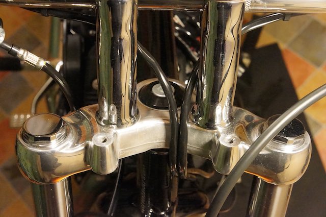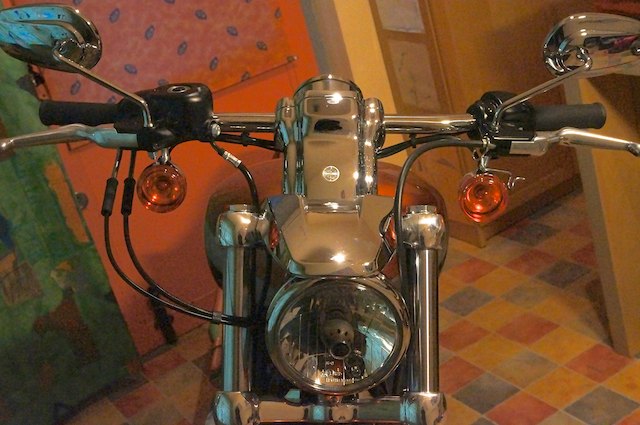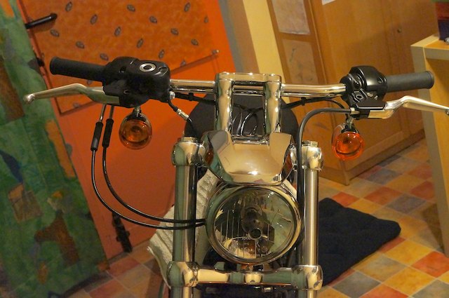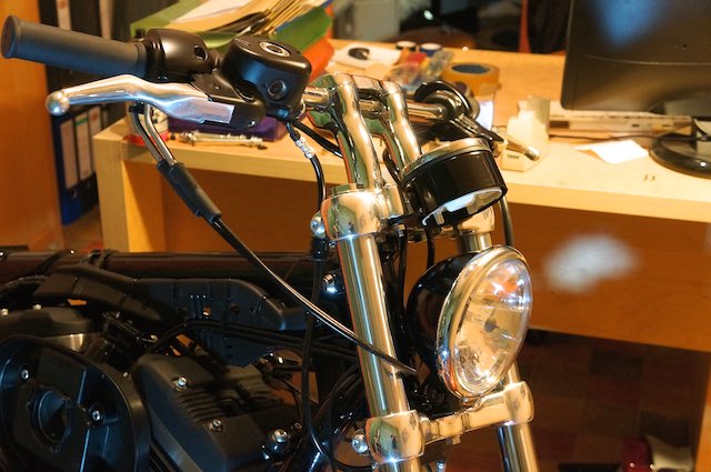 Weil ich die Sitzposition und den originalen Lenker beibehalten wollte, habe ich die Riser mit der Artikel-Nr: 55900023 gekauft. Die Riser haben fast die gleiche Höhe und Kröpfung, ausserdem sehen sie verdammt gut aus :-) Ein passendes Tachogehäuse zu finden, war schwierig. Letztlich habe ich mich für den Halter von Mr. Bobber Custom entschieden, der eigentlich für die schmale Gabel der Iron gedacht ist. Die Befestigungslöcher ließen sich aber soweit auffeilen, dass sie an die ehemaligen Befestigungspunkte des "Chromdaches" passen.