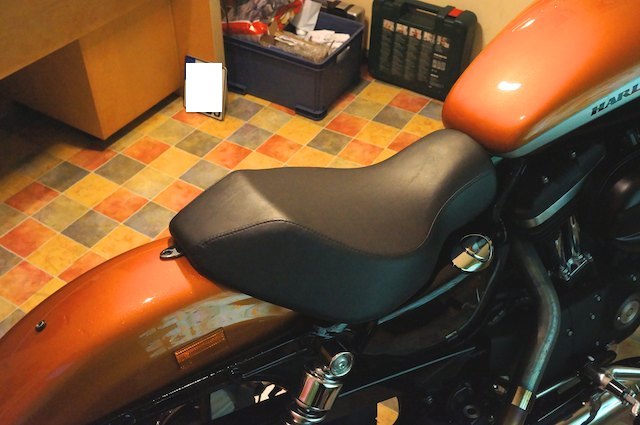 Aber natürlich ist bei solch kurzen Federbeinen der Federweg sehr knapp bemessen und der Federungskomfort auf schlechten Straßen und längeren Strecken nur so mittel. Als preiswerte Sofortmaßnahme habe ich deshalb die 13 Zoll langen Federbeine einer Sportster Iron montiert. Generell sind längere Federbeine in der Harley-Szene eher nicht angesagt, weil sie die flache Optik des Bikes zerstören. Zu einer etwas sportlich orientieren Sportster kann das aber durchaus passen, finde ich. Ausserdem verbessert die etwas steilere Fahrwerksgeometrie das Kurvenverhalten. Auf längere Sicht schaue ich mich wahrscheinlich nach ein paar noch hochwertigeren Federbeinen um. SitzbankEinen tourentauglichen Einzelsitz zu finden war relativ einfach. Der Sitz der 48 schied von vornherein aus, weil er mir zu wenig Halt nach hinten bot, ein (gefederter) Classic-Ledersitz kam wegen des Aussehens nicht in Frage. Gut gefallen hat mir auf Abbildungen der Le Pera BareBones-Sitz für die 48. Leider hat er sich als ziemlich unbequem für mich herausgestellt. Dann fiel mir auf einigen Harley-Werbefotos der CA ein Einzelsitz auf.