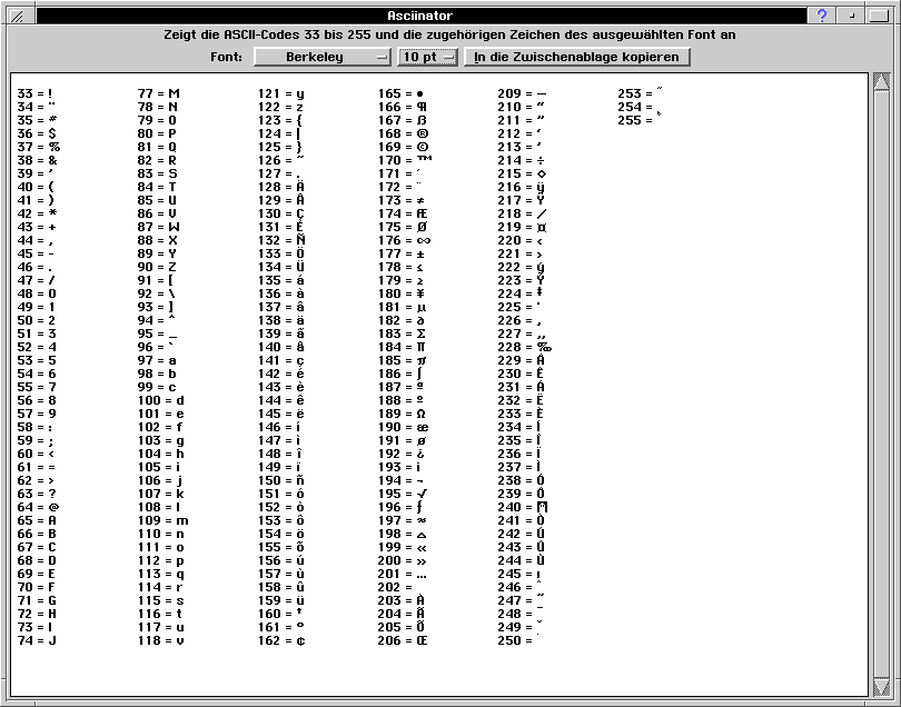 AsciinatorEine simple App, welche die ASCII-Codes 33 bis 255 und die zugehörigen Zeichen des ausgewählten Font anzeigt. Es werden die serienmäßig mitgelieferten Fonts unterstützt. Bei Bedarf kann die gesamte Liste in die Zwischenablage kopiert, oder Teile der Liste per drag & drop in ein anderes Programm gezogen werden.