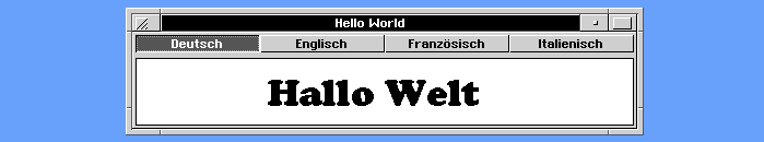 Hello World'Hallo Welt' mal anders. In dem kleinen Übungsprogramm habe ich mich an einem Listen-Objekt (die Leiste mit den vier Buttons) versucht und ein paar kleine Text-/Grafikspielereien ausprobiert.