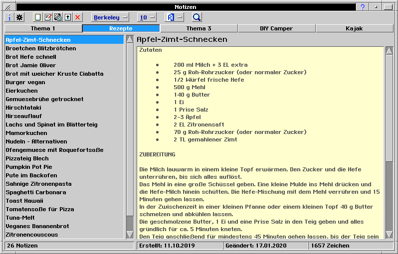 Die App kann jeweils bis zu 100 Textnotizen in fünf verschiedenen Themen verwalten. Ich will die App u.a. verwenden, um häufig benötigte R-BASIC Codeschnipsel zu sammeln. Sie eignet sich aber genauso gut für Rezepte oder 1000 andere Dinge.