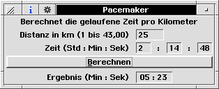 PacemakerWalker / Jogger / Läufer berechnen gerne die Zeit pro gelaufenen Kilometer, um z.B. bei längeren Distanzen ihre Kräfte besser einteilen zu können oder um eine bestimmte Zielzeit zu erreichen. Pacemaker (Wikipedia) macht genau das.
