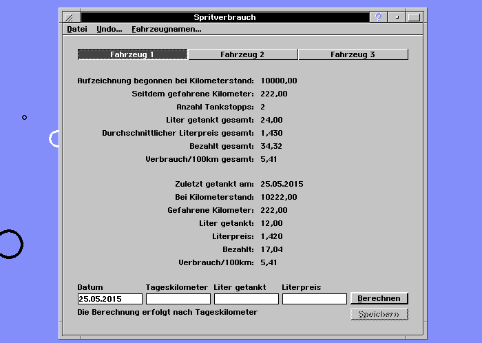 Spritverbrauch errechnet den Durchschnittsverbrauch und weitere statistische Werte von bis zu drei Fahrzeugen. Die Berechnungen können nach "Kilometerstand" oder nach "Tageskilometer" erfolgen.